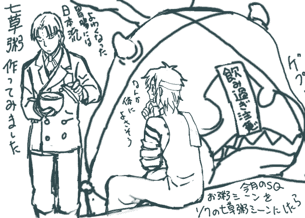 メモ絵:今日、七草粥食べている時に思いつきで描いてみました。本編にこんなシーンはないです。